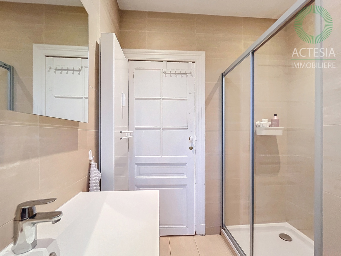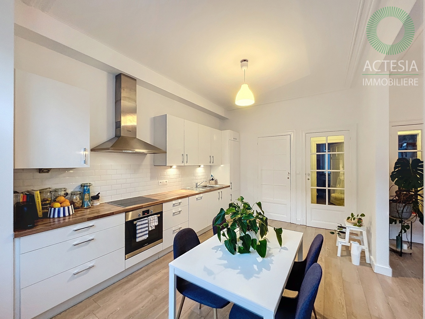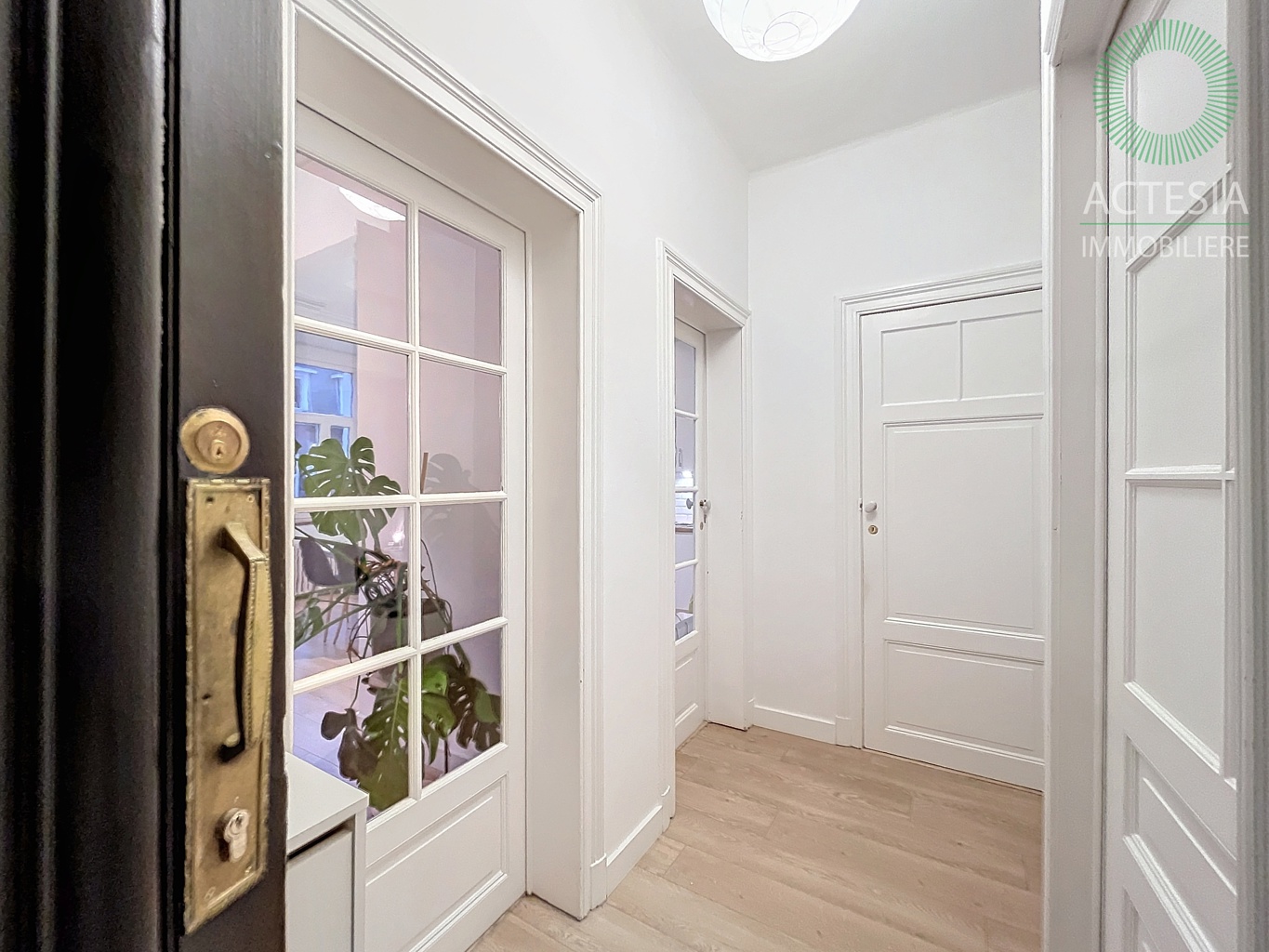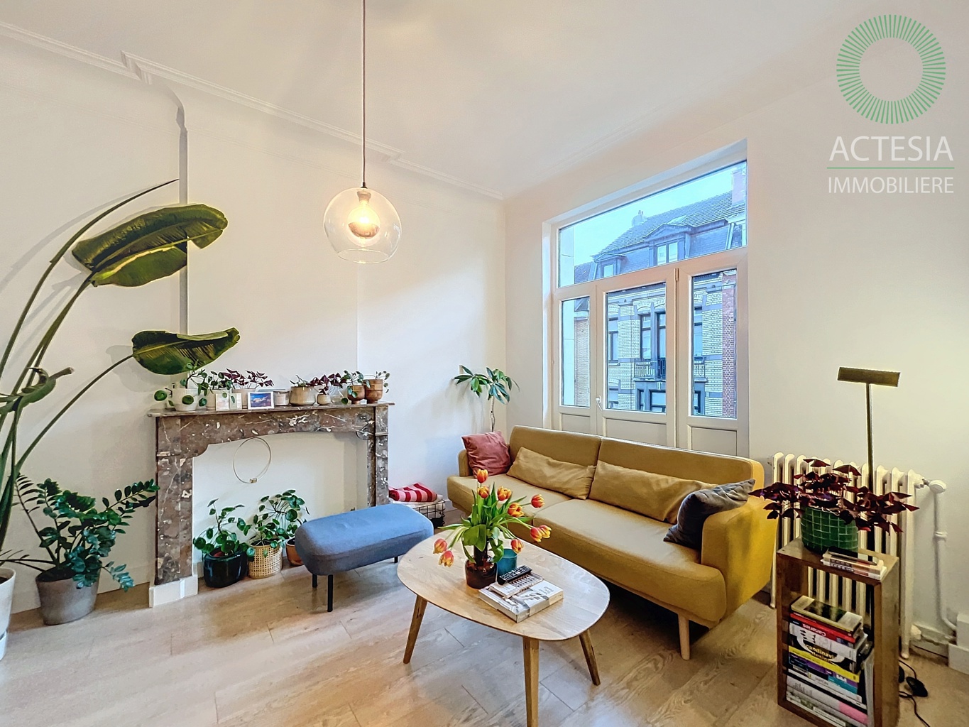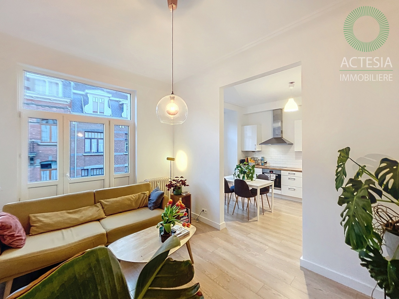 Loyer : 950 € + 150 € de provision de charges pour le chauffage et les communs. Electricité et eau privative. Au cœur d’Ixelles, à proximité de la place Flagey et de la Commission Européenne, superbe appartement cosy et lumineux situé au 2ème étage d’un immeuble de caractère. Il offre une superficie habitable de 70 m2. Il se compose comme suit : hall d’entrée spacieux, wc séparé, un agréable coin salon, une salle à manger avec cuisine ouverte super équipée (évier, taques électriques, four, hotte, frigo, lave-vaisselle), salle de bains avec douche italienne - meuble lavabo – espace pour la machine à laver, une belle grande chambre et un bureau/dressing donnant sur l’arrière. L’appartement est transversant et dispose d’un balcon côté rue et d’un autre avec vue sur le jardin commun. Au rez-de-chaussée : une cave. Confort : appartement très soigné, chauffage central mazout, double vitrage PVC, parlophone Excellente situation : proche de tous les commerces, la gare du Luxembourg, les bus, les écoles et les axes autoroutiers.