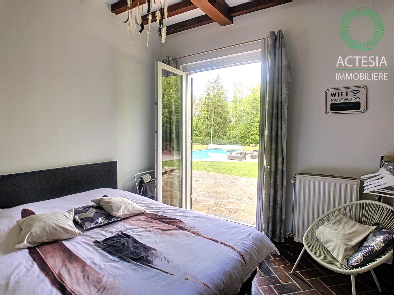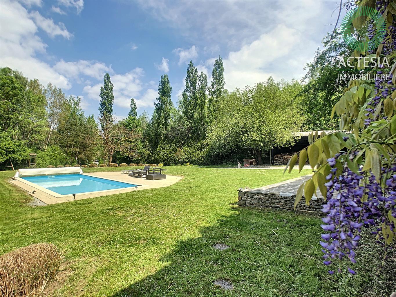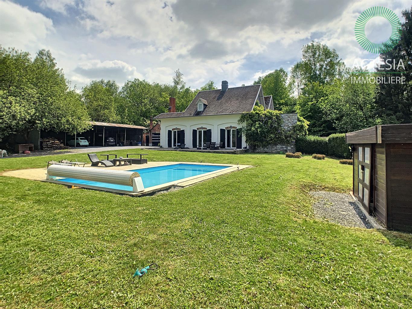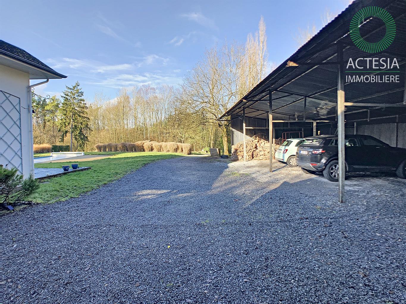 Faire offre à partir de 780.000€ sous réserve de l'accord des propriétaires. Au coeur de Ciney, ensemble immobilier aux multiples possibilités d’exploitation situé sur un magnifique terrain de 2 hectares 18 ares 48 centiares. Dans un cadre vert et idyllique, superbe villa scindée en deux parties : Partie 1 : villa principale en pierre composée au rez-de-chaussée d’un séjour très lumineux de + ou – 27 m² avec vue sur le beau terrain et la piscine chauffée. Une cuisine hyper équipée avec îlot central donnant sur un agréable patio, une buanderie, une salle de bain et une chambre récemment aménagée. A l’étage, les 3 autres chambres. A l’extérieur, à côté de la villa est situé un spacieux garage de + ou - 70 m², 2 granges attenantes et un hangar ouvert de + ou – 170 m². Idéal pour un entrepreneur ou pour une autre rentrée locative. Bon niveau de confort : maison prête à vivre, chauffage central au mazout (cassette et feu ouvert), châssis double vitrage PVC, électricité bi-horaire. Partie 2 : annexe qui jouxte la villa principale. Son rez-de-chaussée se compose d’un très grand séjour (salon et salle à manger) de + ou - 72 m² avec un wc séparé, un salon de + ou -16 m² et une cuisine équipée de + ou - 18 m². A l'étage : 2 belles chambres et une salle de bains. Bon niveau de confort : maison prête à vivre, chauffage central au mazout (chauffage par le sol au rez-de-chaussée), châssis double vitrage PVC, électricité bi-horaire. Une tiny-house (roulotte) a été placée au fond du terrain. Aménagée avec beaucoup de charme, elle est louée régulièrement. Rentabilité intéressante de + ou - 900 € brut /mois. Possibilité d’en placer une deuxième. Environnement de qualité : à côté du ravel, dans un coin très vert, reculé des bruits de la circulation, mais à deux pas de la nationale 4 et de la E411. A proximité également des commerces et des écoles.