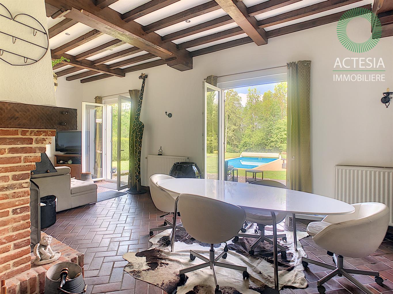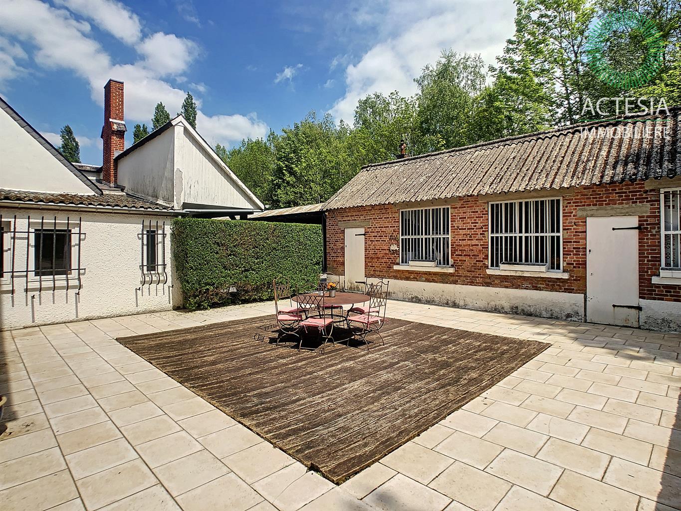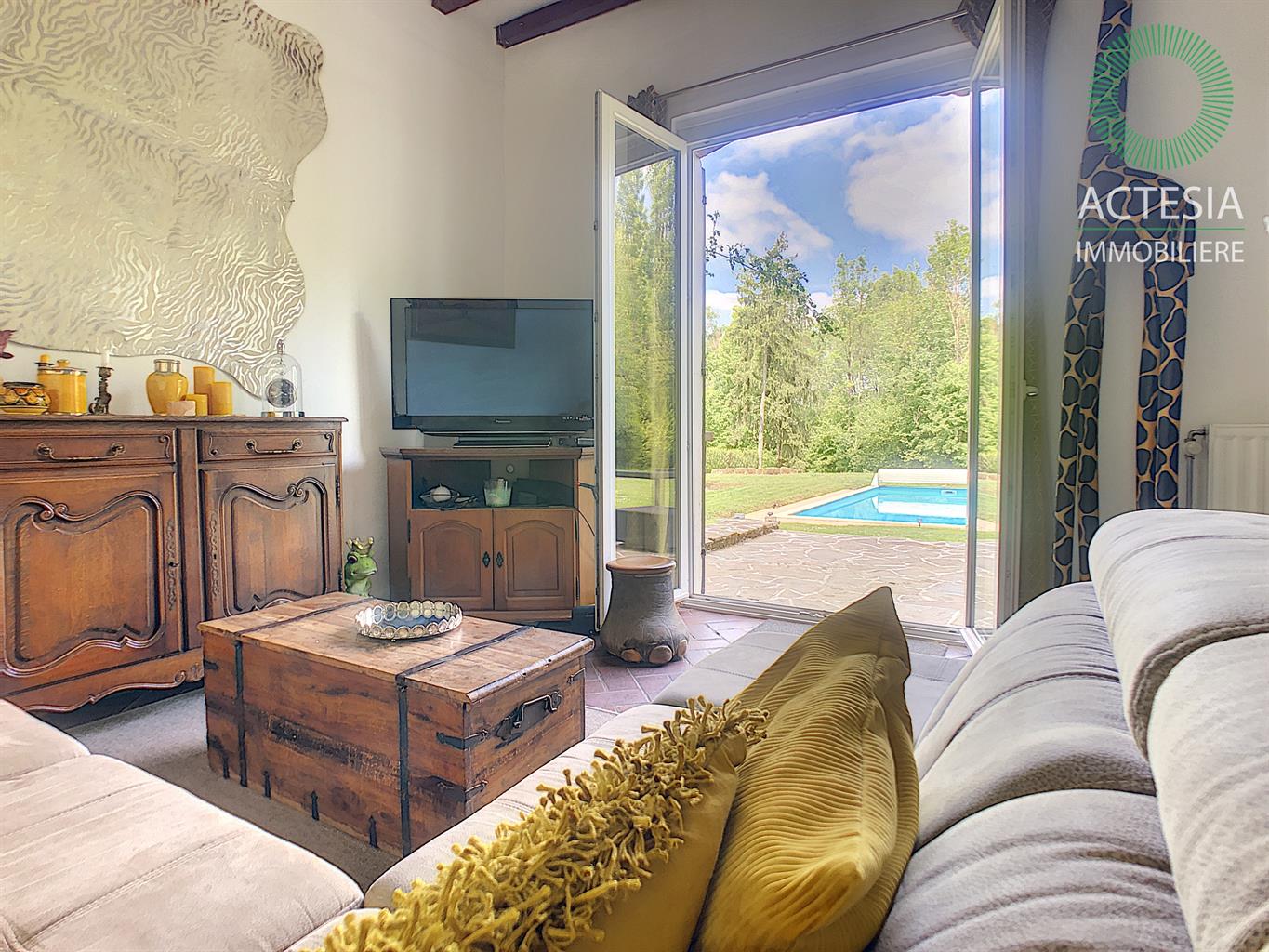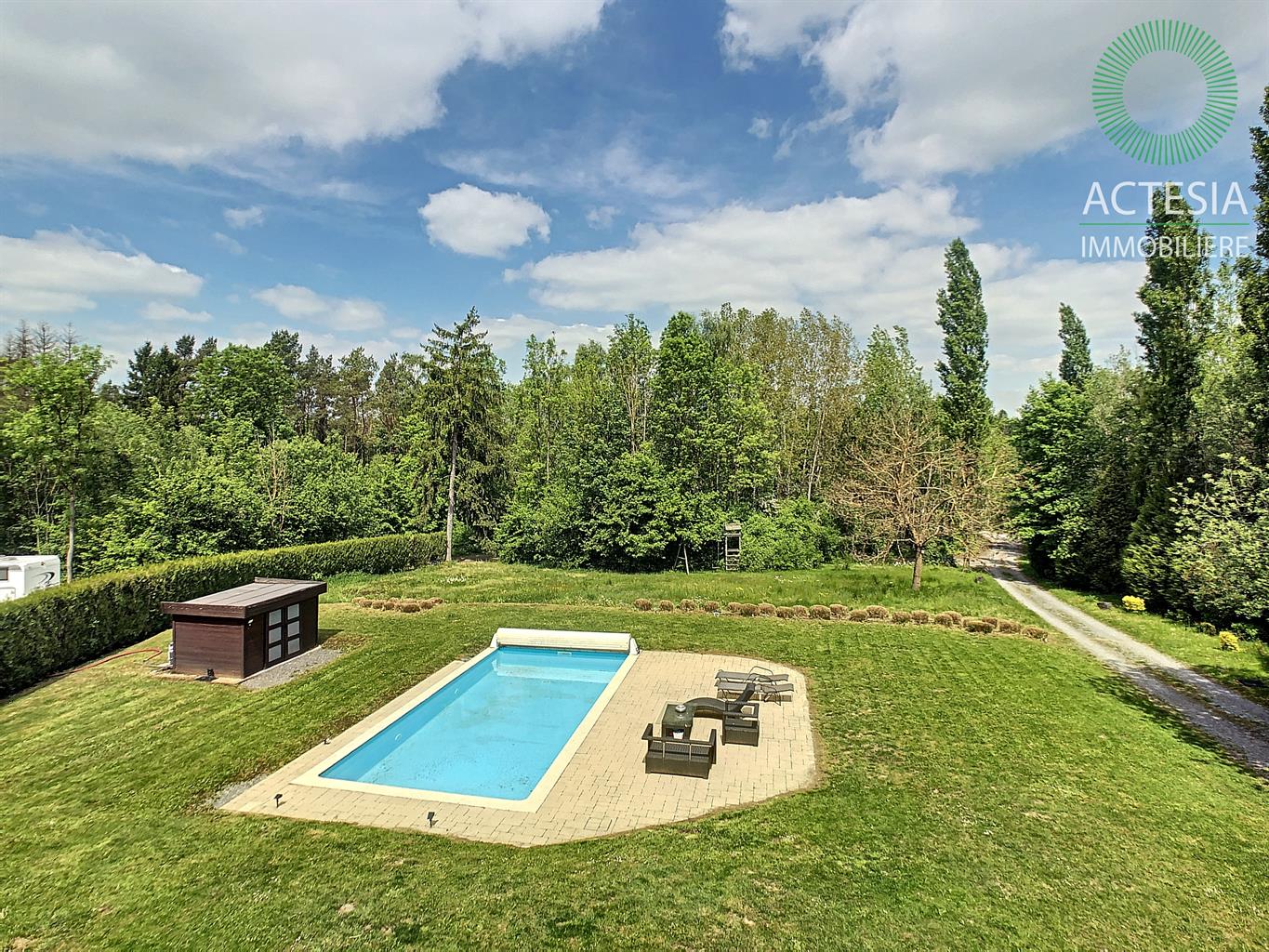 Faire offre à partir de 780.000€ sous réserve de l'accord des propriétaires. Au coeur de Ciney, ensemble immobilier aux multiples possibilités d’exploitation situé sur un magnifique terrain de 2 hectares 18 ares 48 centiares. Dans un cadre vert et idyllique, superbe villa scindée en deux parties : Partie 1 : villa principale en pierre composée au rez-de-chaussée d’un séjour très lumineux de + ou – 27 m² avec vue sur le beau terrain et la piscine chauffée. Une cuisine hyper équipée avec îlot central donnant sur un agréable patio, une buanderie, une salle de bain et une chambre récemment aménagée. A l’étage, les 3 autres chambres. A l’extérieur, à côté de la villa est situé un spacieux garage de + ou - 70 m², 2 granges attenantes et un hangar ouvert de + ou – 170 m². Idéal pour un entrepreneur ou pour une autre rentrée locative. Bon niveau de confort : maison prête à vivre, chauffage central au mazout (cassette et feu ouvert), châssis double vitrage PVC, électricité bi-horaire. Partie 2 : annexe qui jouxte la villa principale. Son rez-de-chaussée se compose d’un très grand séjour (salon et salle à manger) de + ou - 72 m² avec un wc séparé, un salon de + ou -16 m² et une cuisine équipée de + ou - 18 m². A l'étage : 2 belles chambres et une salle de bains. Bon niveau de confort : maison prête à vivre, chauffage central au mazout (chauffage par le sol au rez-de-chaussée), châssis double vitrage PVC, électricité bi-horaire. Une tiny-house (roulotte) a été placée au fond du terrain. Aménagée avec beaucoup de charme, elle est louée régulièrement. Rentabilité intéressante de + ou - 900 € brut /mois. Possibilité d’en placer une deuxième. Environnement de qualité : à côté du ravel, dans un coin très vert, reculé des bruits de la circulation, mais à deux pas de la nationale 4 et de la E411. A proximité également des commerces et des écoles.